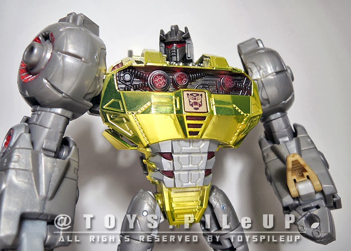The repainted Grimlock immediately standout among the rest in robot mode. This is due to the eye blinding 'shiny' gold chrome on his chest plus the generous details that Hasbro has added throughout the figure. The mixture of Clear red and Gold chrome is indeed an excellent choice.